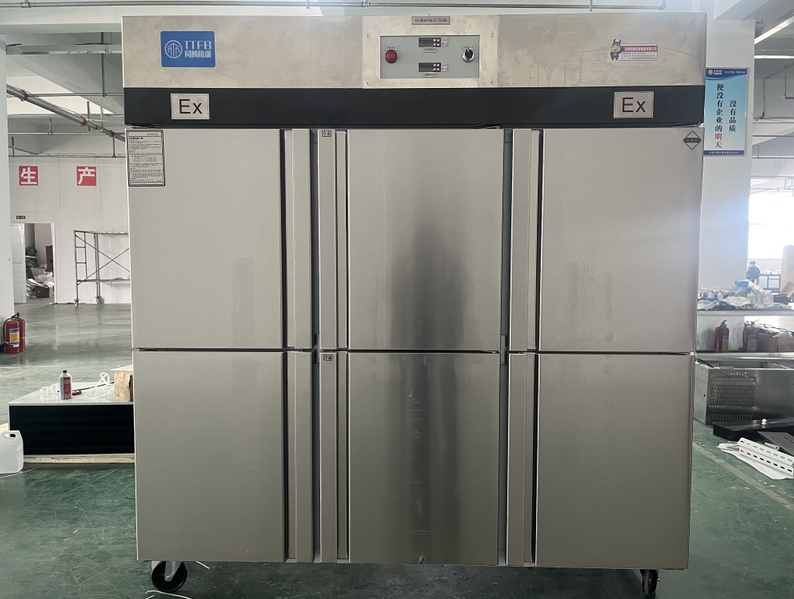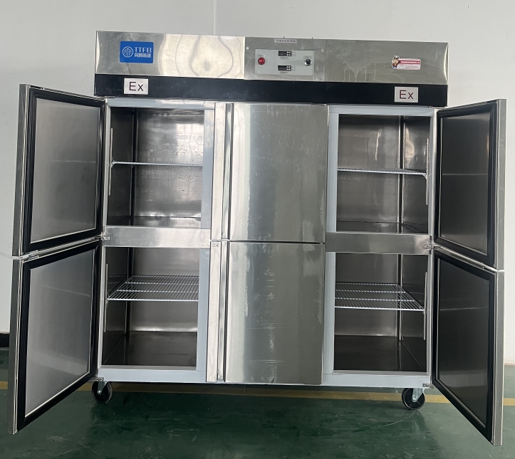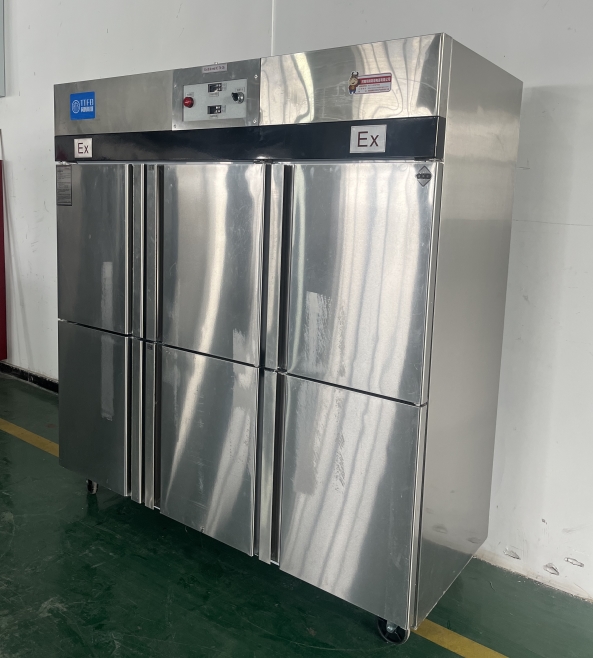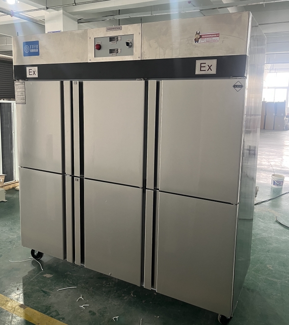 我公司生產的六門不銹鋼同騰防爆冰箱(以下簡稱防爆冰箱),產品防爆要求是根據GB3836.1-2010《爆炸性環(huán)境 第1部分:設備 通用要求》、GB3836.2-2010《爆炸性環(huán)境 第2部分:由隔爆外殼“d”保護的設備》、GB3836.4-2010《爆炸性環(huán)境 第4部分:由本質安全型“i”保護的設備》、GB3836.9-2006《爆炸性氣體環(huán)境用電氣設備 第9部分 澆封型“m”》及GB3836.15-2017《爆炸性氣體環(huán)境用電氣設備 第15部分:電氣裝置的設計、選型和安裝》的規(guī)定制成防爆結構,經國家授權的質量監(jiān)督檢驗部門檢驗合格,其防爆標志為ExdbibmbⅡCT4 Gb。適用于工廠存在或可能存在ⅡA、ⅡB級、ⅡC,T1~T4組可燃性氣體、蒸氣與空氣混合形成的爆炸危險1區(qū)或2區(qū)場所。該產品經國家防爆電氣產品質量監(jiān)督檢驗中心檢驗合格并取得了防爆合格證??照{機廣泛適用于石油、化工、冶金、制藥和國防工業(yè)等空氣中存在爆炸性氣體混合物的自封閉的室內之用。